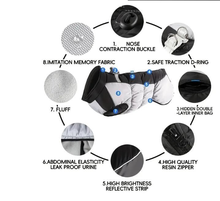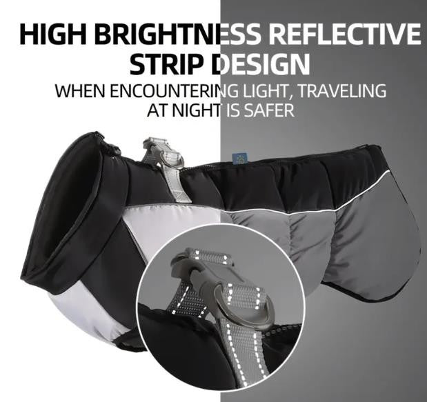 Extra-große Hundejacke mit reflektierenden Streifen, wasserdichtem Obermaterial und 100 % Polyesterfüllung. Schützt zuverlässig vor Kälte, Wind und Nässe – perfekt für Herbst & Winter.