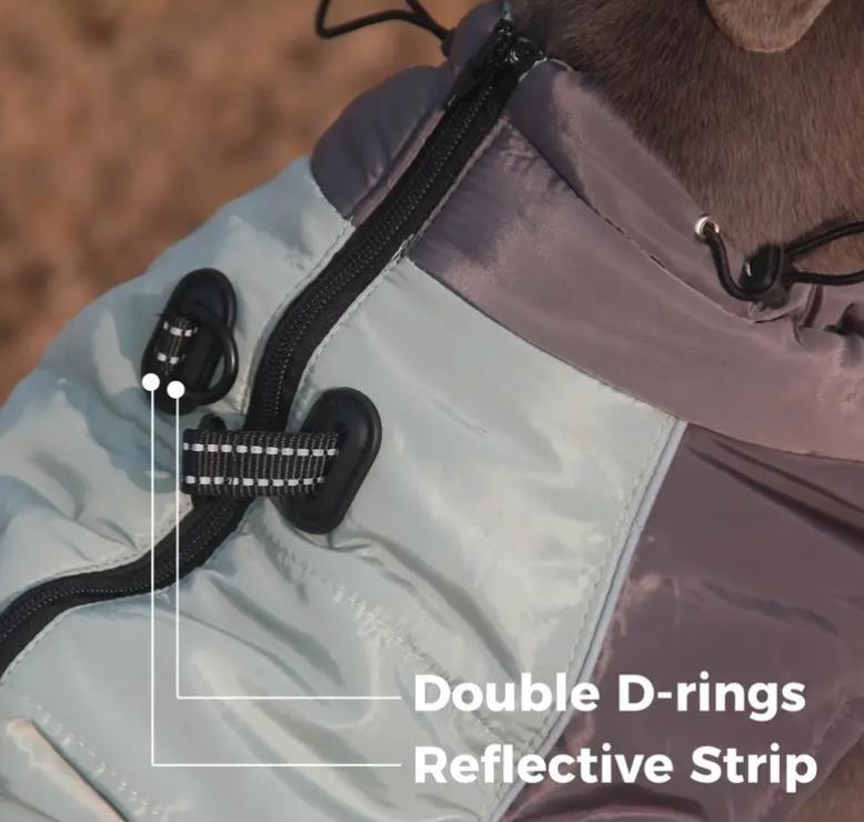 Der praktische Rückenreißverschluss sorgt für schnelles An- und Ausziehen, während elastisches Taillendesign und verstellbares Halsband einen bequemen Sitz garantieren. Reflektierende Elemente erhöhen die Sichtbarkeit bei Dunkelheit, und das integrierte D-Ring-Geschirr ermöglicht einfaches Anleinen ohne zusätzliches Geschirr.