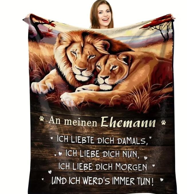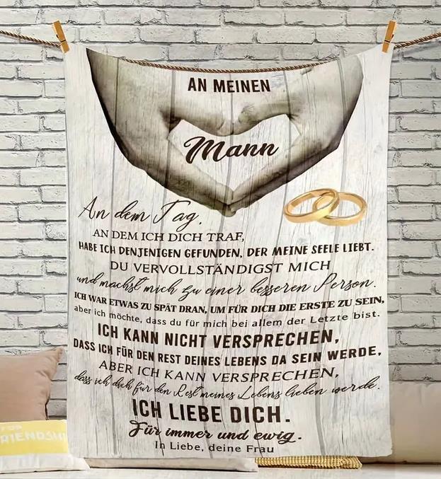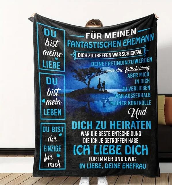 Auf der Decke sind liebevolle Botschaften an Ihren Mann aufgedruckt, die Ihre Zuneigung, Fürsorge und Liebe ausdrücken. Selbst wenn Sie gerade nicht zusammen sind, vermittelt die Decke das Gefühl einer herzlichen Umarmung und zeigt, dass er niemals allein ist. Sie spendet Kraft, Zuspruch und ein warmes Gefühl von Nähe.