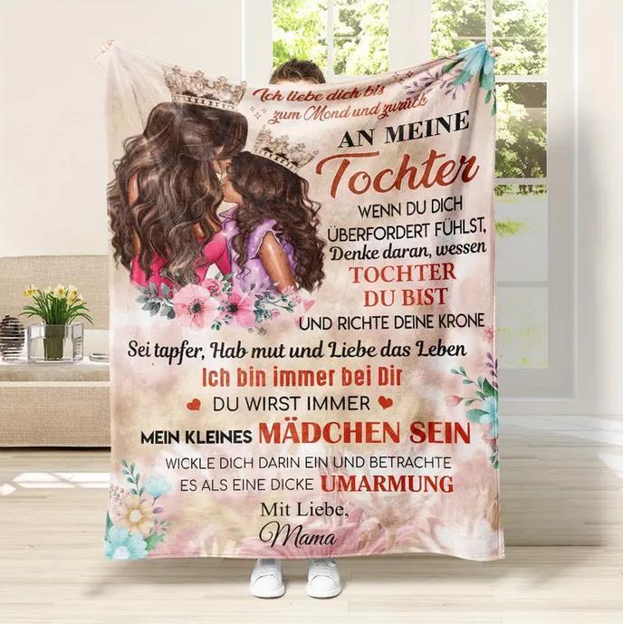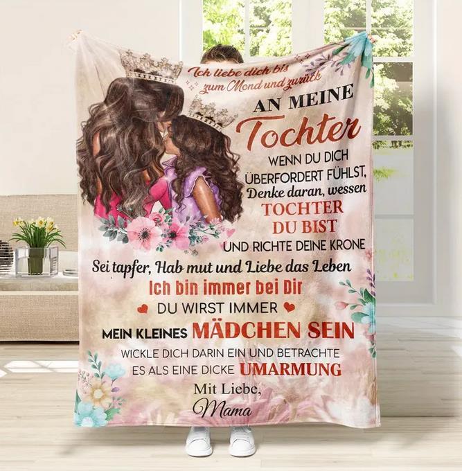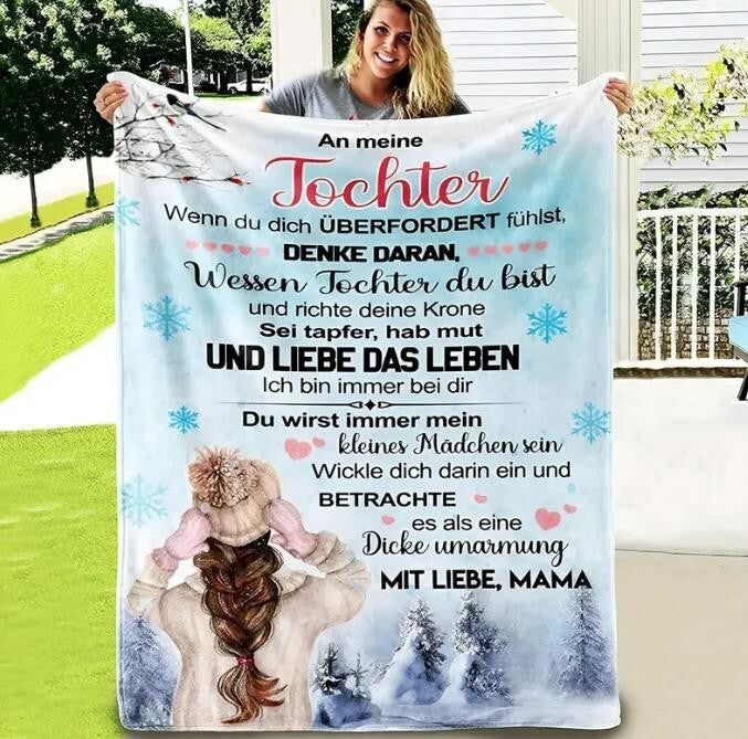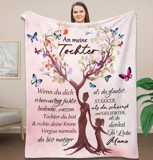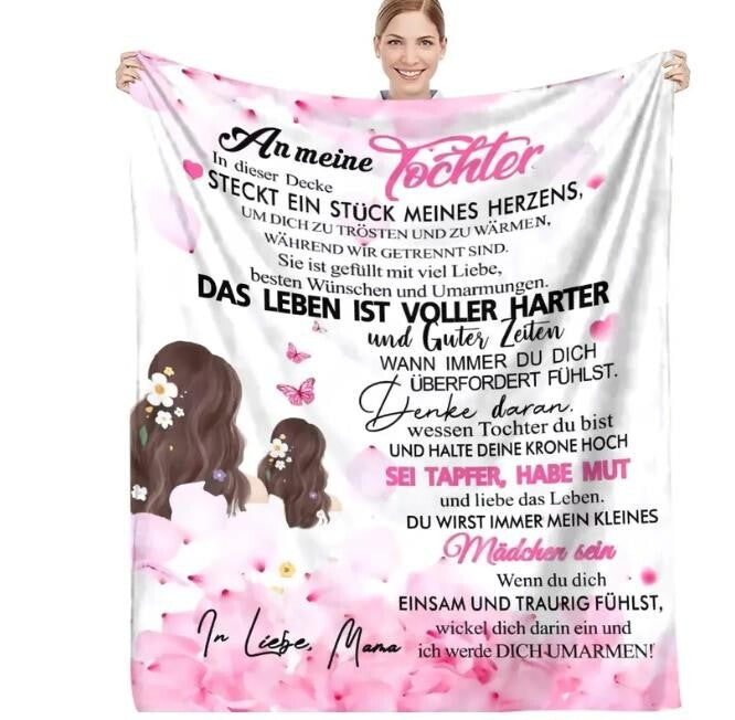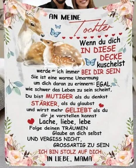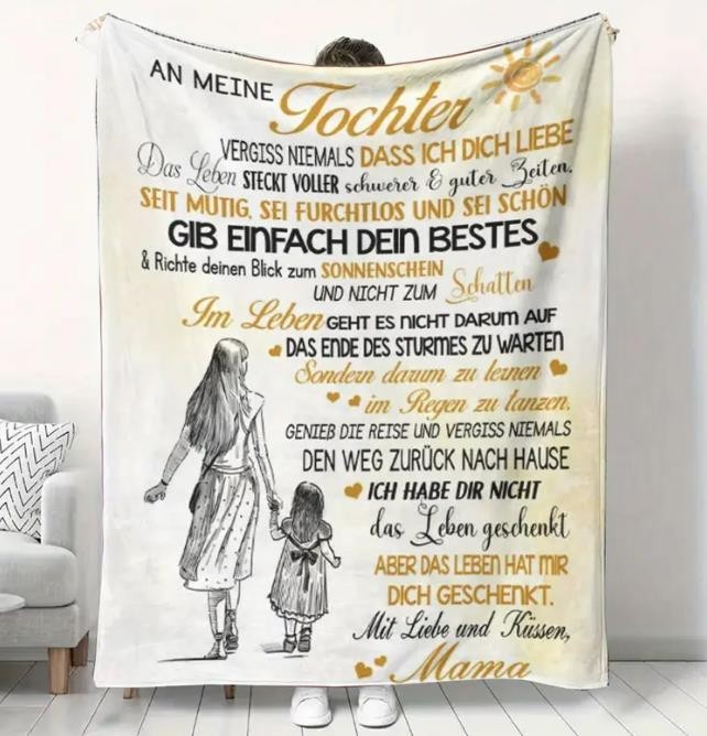 Mehr als nur eine Decke – diese persönliche Kuscheldecke ist wie eine ständige Umarmung von Mama. Sie steht für Wärme, Geborgenheit und die besondere Verbindung zwischen Mutter und Tochter. Ob zum Einkuscheln auf dem Sofa, beim Entspannen im Bett oder als liebevolles Geschenk – diese Decke erinnert jeden Tag daran, dass Mamas Liebe immer bei dir ist.
